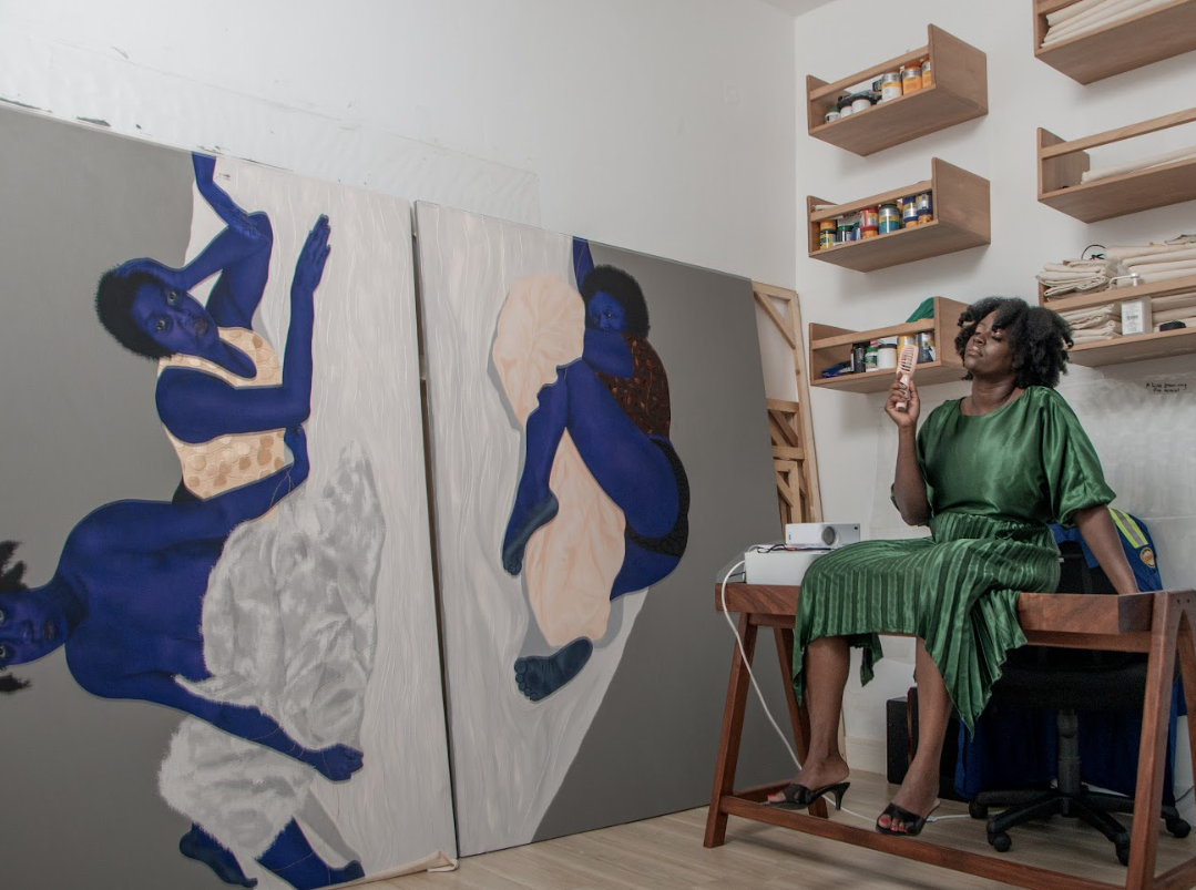 Black Femininity is the frontier of Abe’s work and artistic ethos. Here she creates space for black female bodies to be at ease and to remain vulnerable. Here she is allowed to be whoever she wants to be: relaxed in posture, not trying to do anything but taking up space in any way and by any means. The colour indigo is the nodal heartbeat across her body of work. One element also feeds into another through memory and personal story, which is her preferred method of collating her upbringing in Uganda. Indigo, as a skin and fabric tone speaks to a rich association with royalty. “Symbolism and meaning, they’re all attached to cloth,” says Abe. Subjects for portraiture are plucked from her life — a connection she maintains in integrity to her practice. These subjects inform her past but are also a part of something larger than herself. Moving between the self and the present affords her space to rewrite the stories of her own life. Says the artist, “Memories remind me of the autobiographical aspect of my work, and my purpose: To rewrite history.”