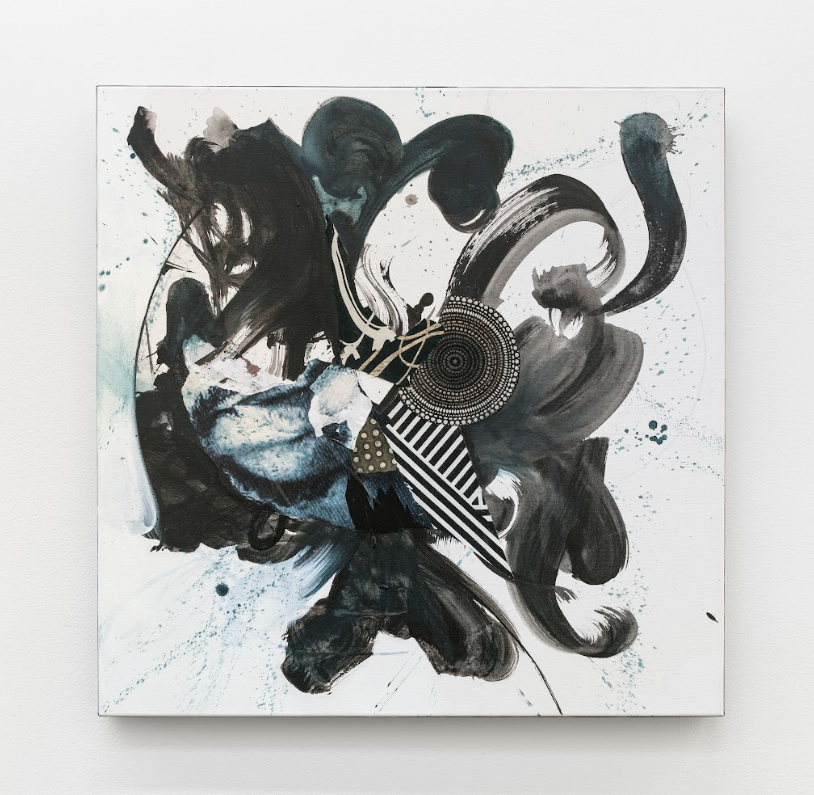 His last breath became a storm, 2022. Ink, acrylic, vintage fabric and collage on canvas. 30 x 30 x 1.5 inches.