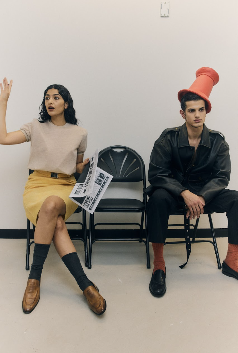 Roxie (left) wears Prada skirt and top, Miu Miu shoes. Tom (right) wears Coach jacket, Strateas Carlucci pants, LEAIR hat, Tod's shoes.
