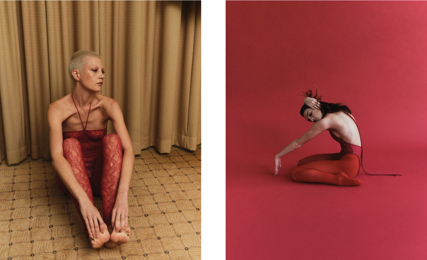Left jumpsuit Common Hours, Right leotard Common Hours, hosiery stylist’s own