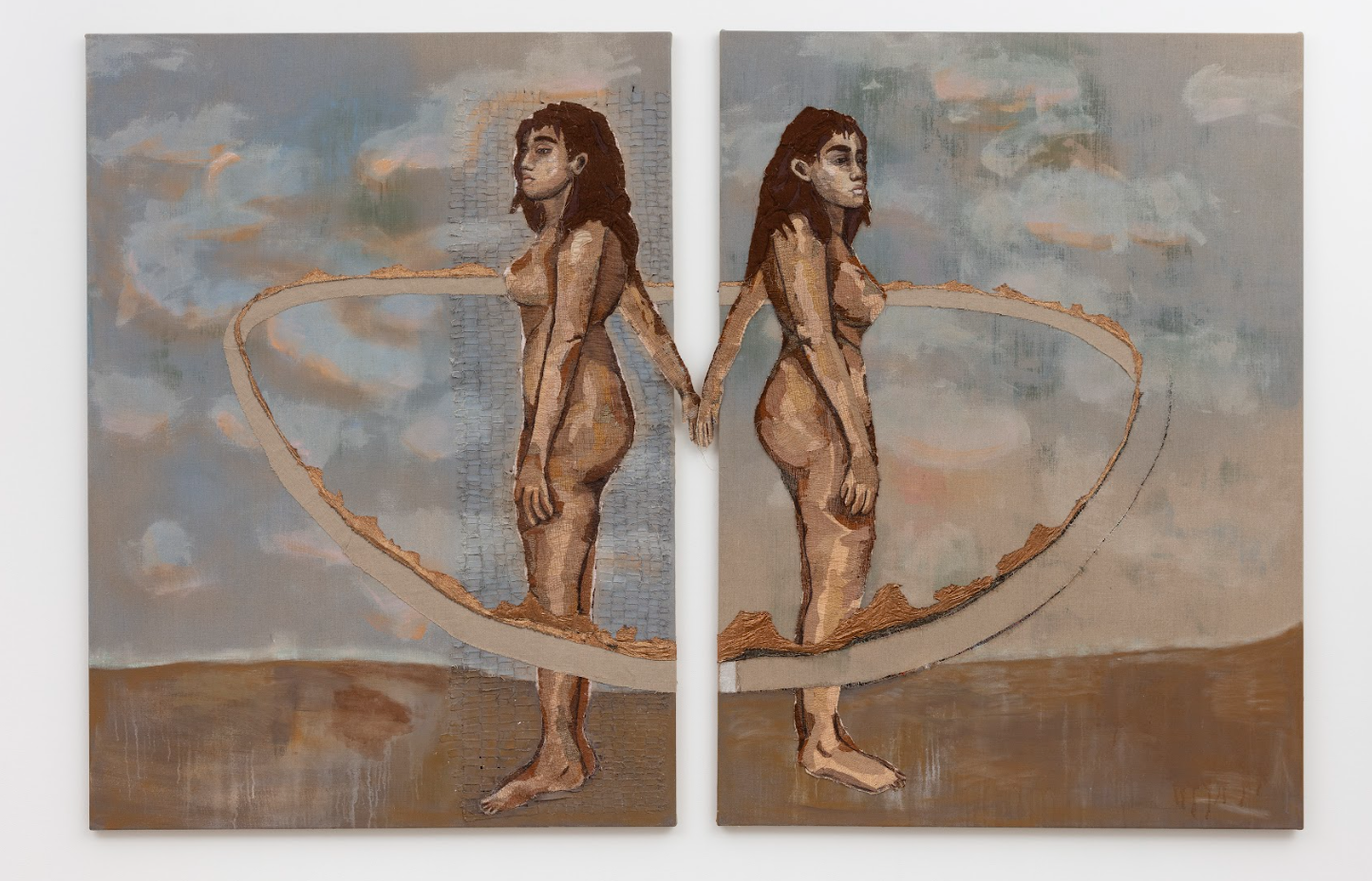 Julia Gutman, I'll be your mirror (for Azazel), 2025, found textiles, embroidery and acrylic paint on linen, 230 x 350 cm. Photography by Simon Hewson. Image courtesy of the artist and Sullivan+Strumpf.