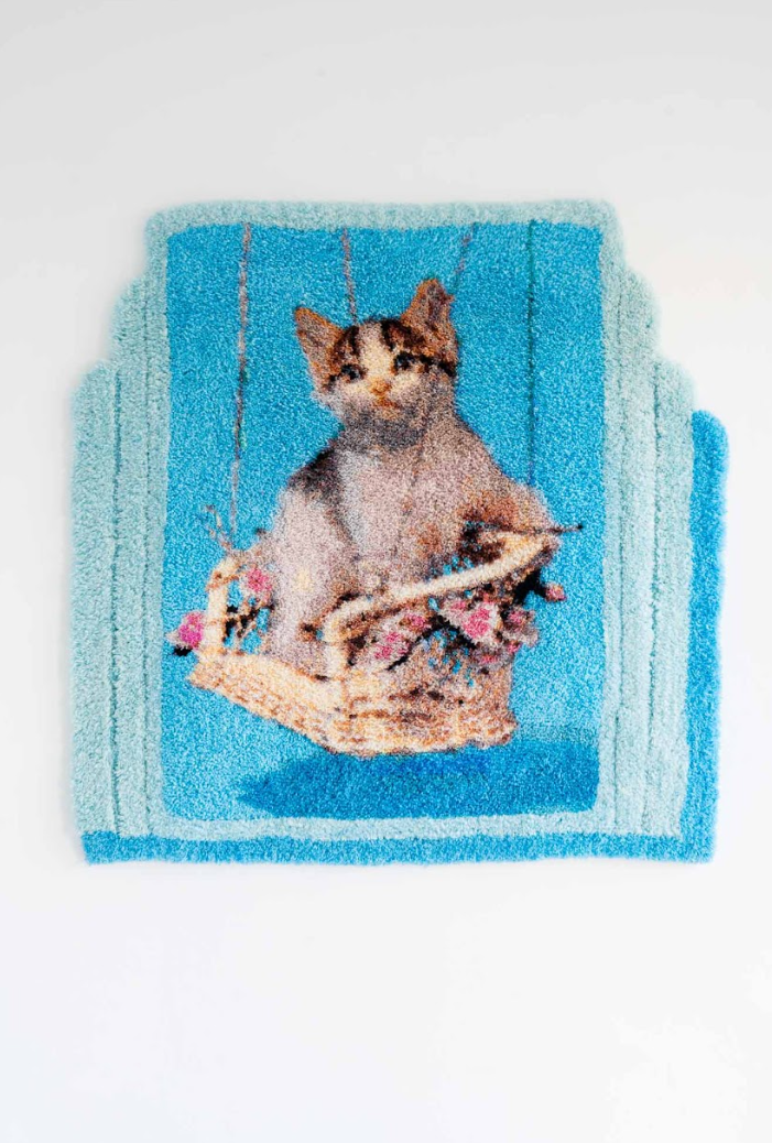 Bridget Stehli, Kitten (blue), 2024, oil on panel, wood, satin, polyester fibre filling, lace, 24cm x 27cm. Courtesy of the artist.