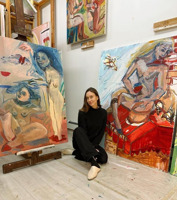 JM: I think the works resist that pressure by slowing things down. The scenes are often very quiet — women sitting, holding, resting — but they’re not passive. There’s a psychological density in those moments. Even something like a hand resting across a body or a shared posture between figures becomes charged. I’m interested in how the ordinary can hold complexity without needing to be performed or elevated.